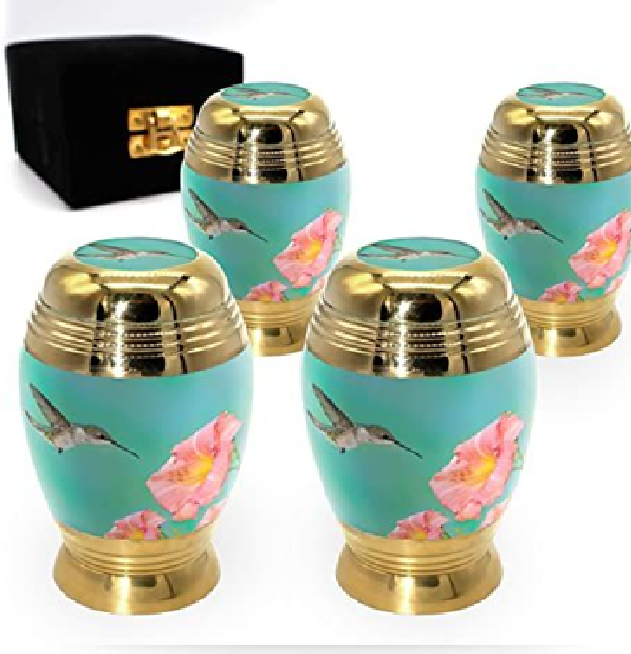 ชุดโกศขนาดเล็กสีเขียวอมฟ้า 4 ใบ พร้อมลวดลายดอกไม้และนก เล็กและน่ารัก มีจำหน่ายในราคาขายส่ง
