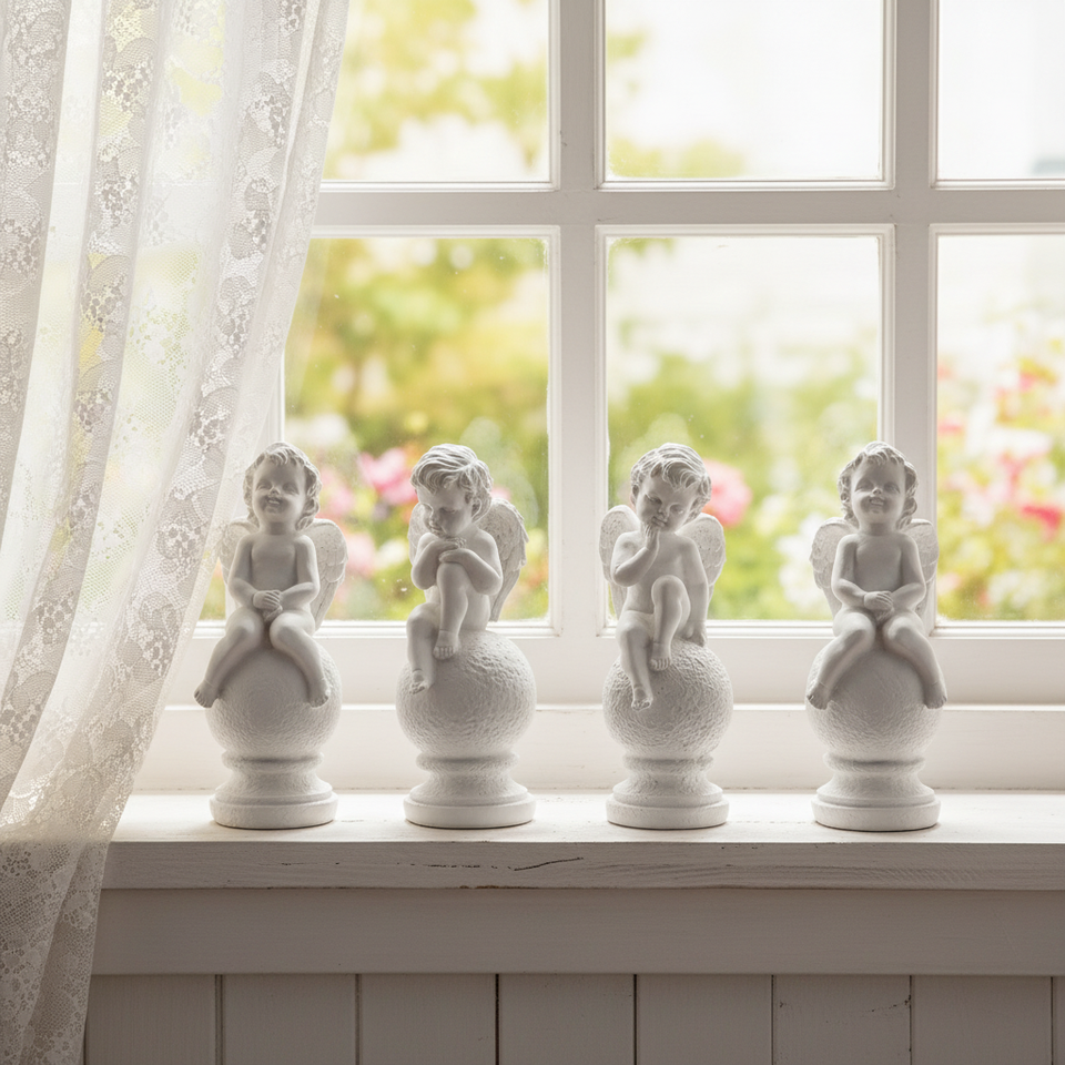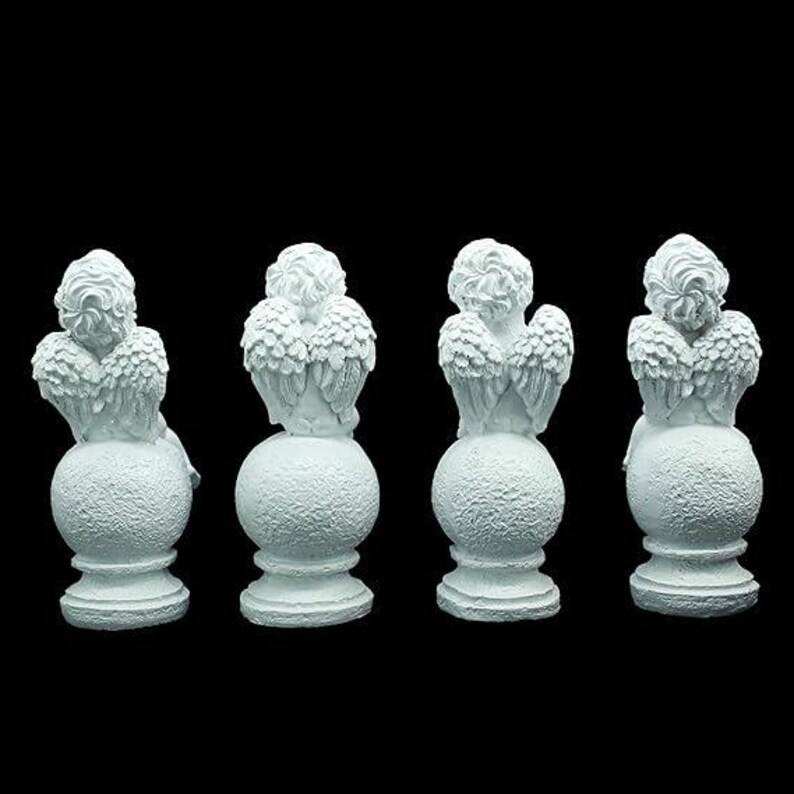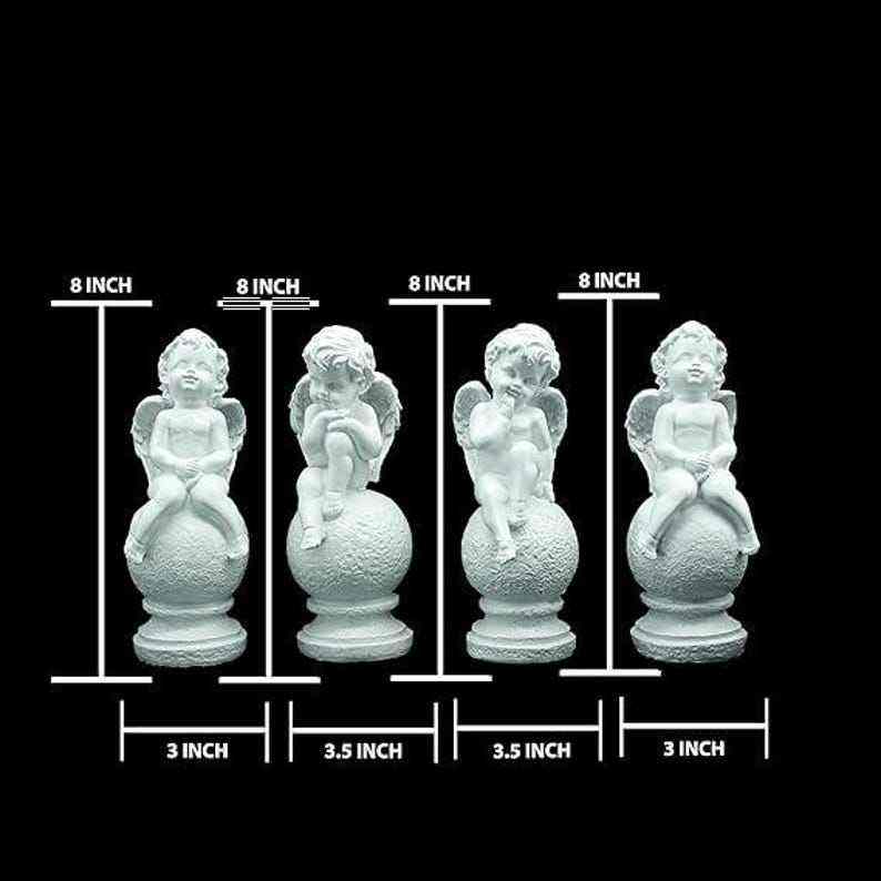 ชุดตุ๊กตานางฟ้าสีขาวสี่ตัวพร้อมทรงกลมมีลวดลาย รูปปั้นเรซิ่นศิลปะสำหรับตกแต่งชั้นวางหนังสือและบ้าน