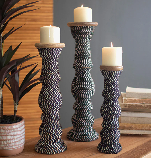 ชุดเชิงเทียนสูงสามชิ้นที่ห่อด้วยเชือกทอสีดำและสีขาวพร้อมเสื้อไม้ธรรมชาติในราคาขายส่ง