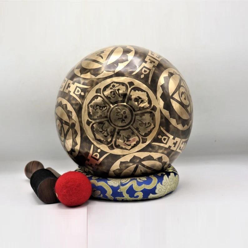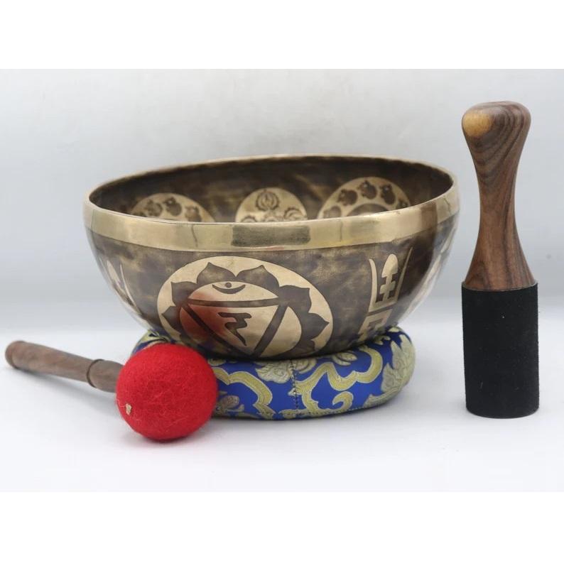 ชามร้องเพลงทองเหลืองจักระทั้งเจ็ดชามร้องเพลงทิเบตทำด้วยมือทรงกลมจากเนปาล