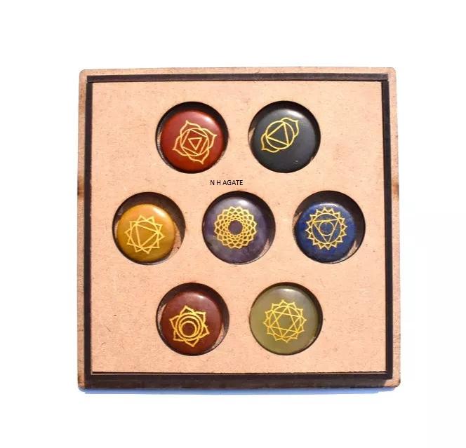 ชุดสัญลักษณ์เจ็ดจักระแบบกลมสลักพร้อมกล่องไม้ ชุดกล่องหินเจ็ดจักระทรงกลมคุณภาพดีที่สุดสำหรับการทำสมาธิ