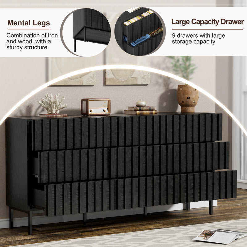 ตู้ลิ้นชัก9ด้านข้างทำจากไม้ซี่โครงพร้อมร่องแนวตั้งด้านหน้าและขาโลหะสำหรับห้องนั่งเล่นหรือที่เก็บของในโรงแรม