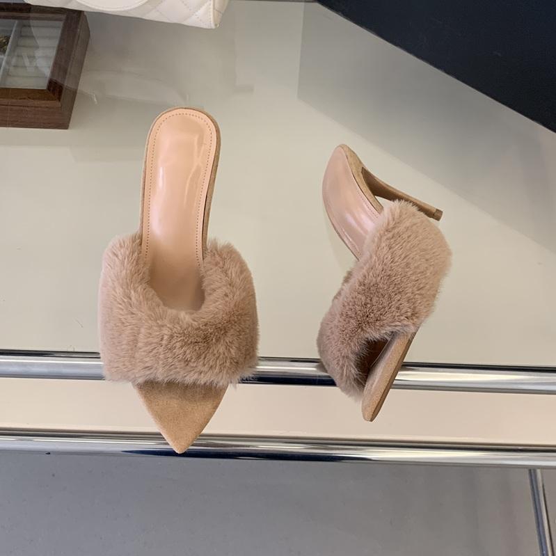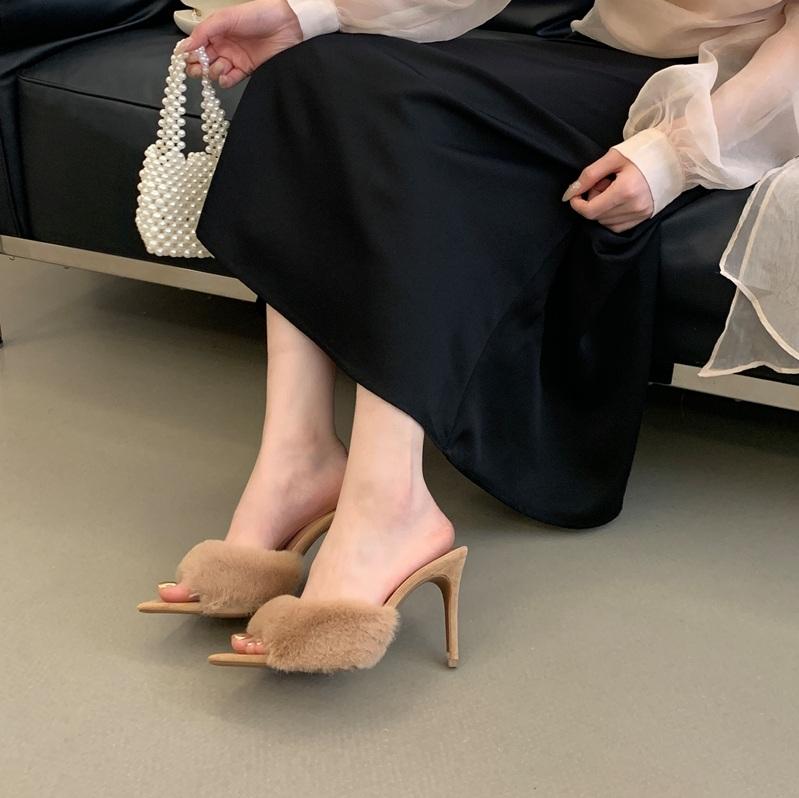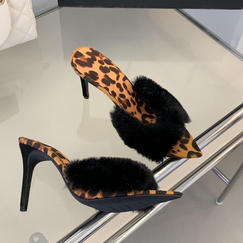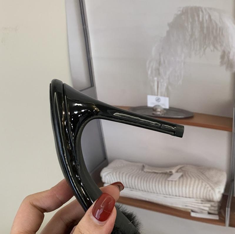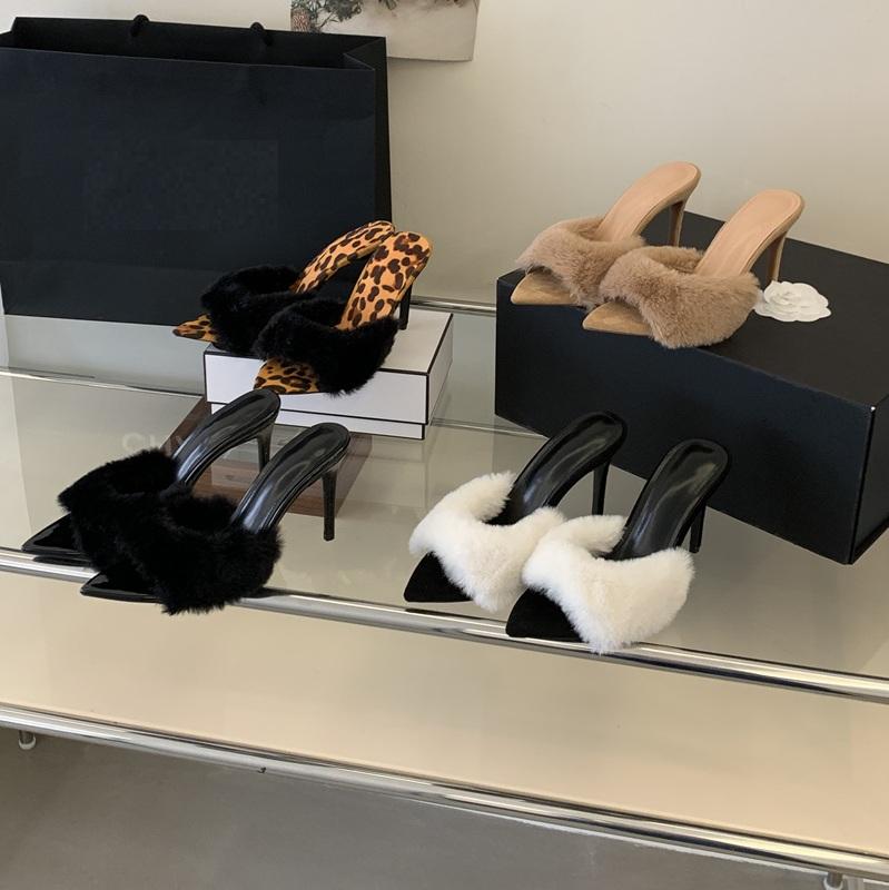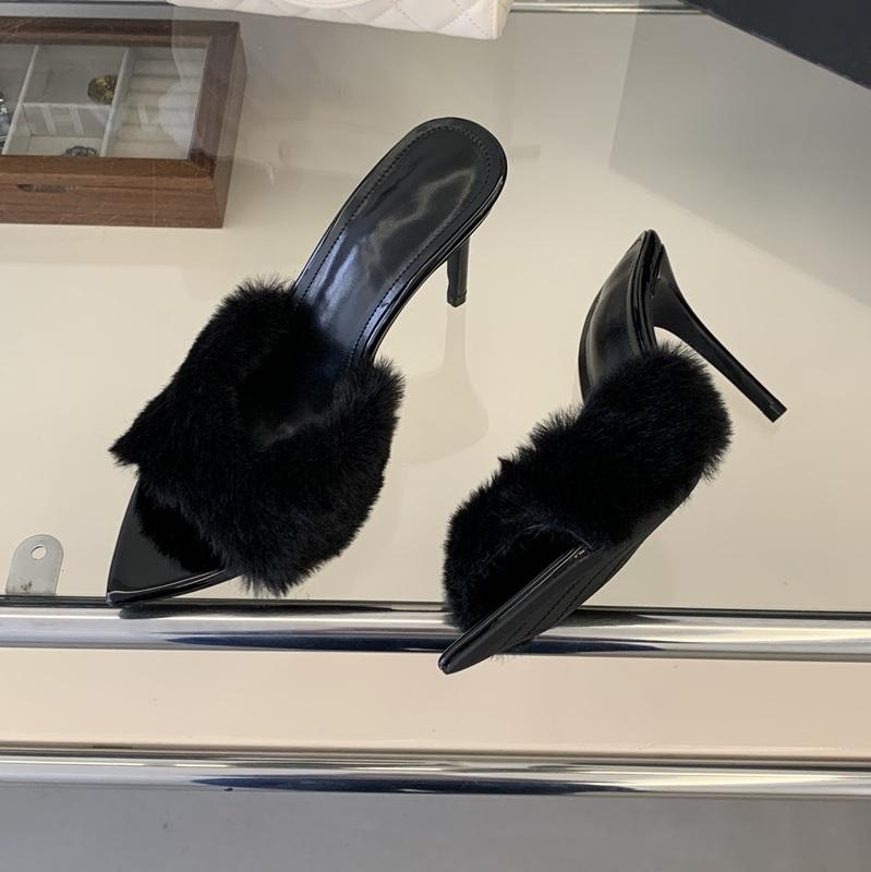 รองเท้าส้นเข็มขนเฟอร์หัวแหลม9ซม. เซ็กซี่สำหรับผู้หญิง