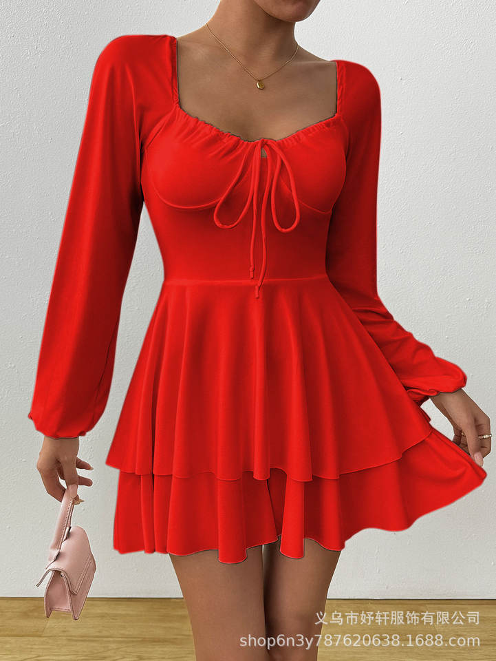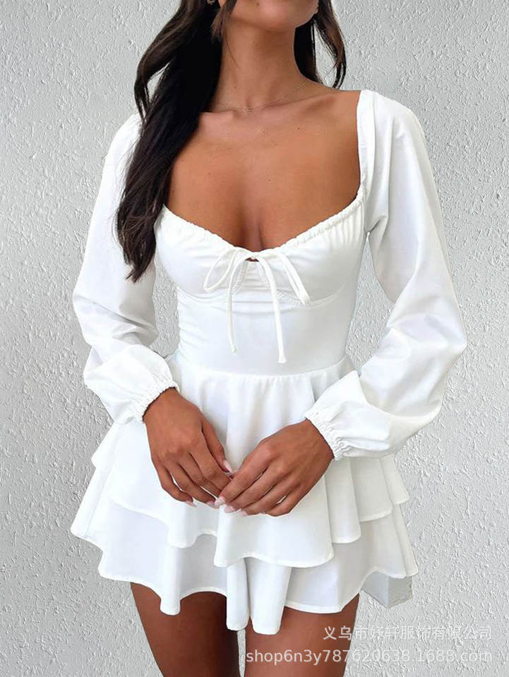 ชุดเดรสแขนยาวคอวีเปลือยหลังเซ็กซี่และสง่างามกระโปรงสั้นแต่งระบายขอบจีบขอบสีขาวแบบผูกเชือก