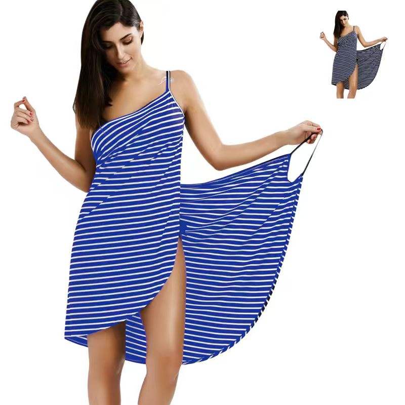 ชุดเดรสคลุมชายหาดลายทางสำหรับผู้หญิงไซส์ใหญ่ สายเดี่ยว โชว์หลัง เซ็กซี่ ความยาวระดับเข่า เหมาะสำหรับฤดูร้อน