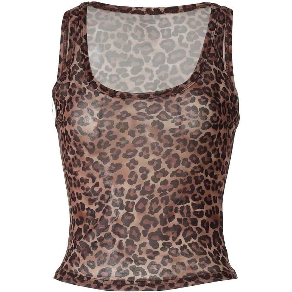 เสื้อกล้ามตาข่ายลายเสือชีตาห์เซ็กซี่สำหรับผู้หญิง เสื้อครอปถักเนื้อผ้าระบายอากาศดี มองทะลุได้ ผลิตจากผ้าโพลีเอสเตอร์ 100%