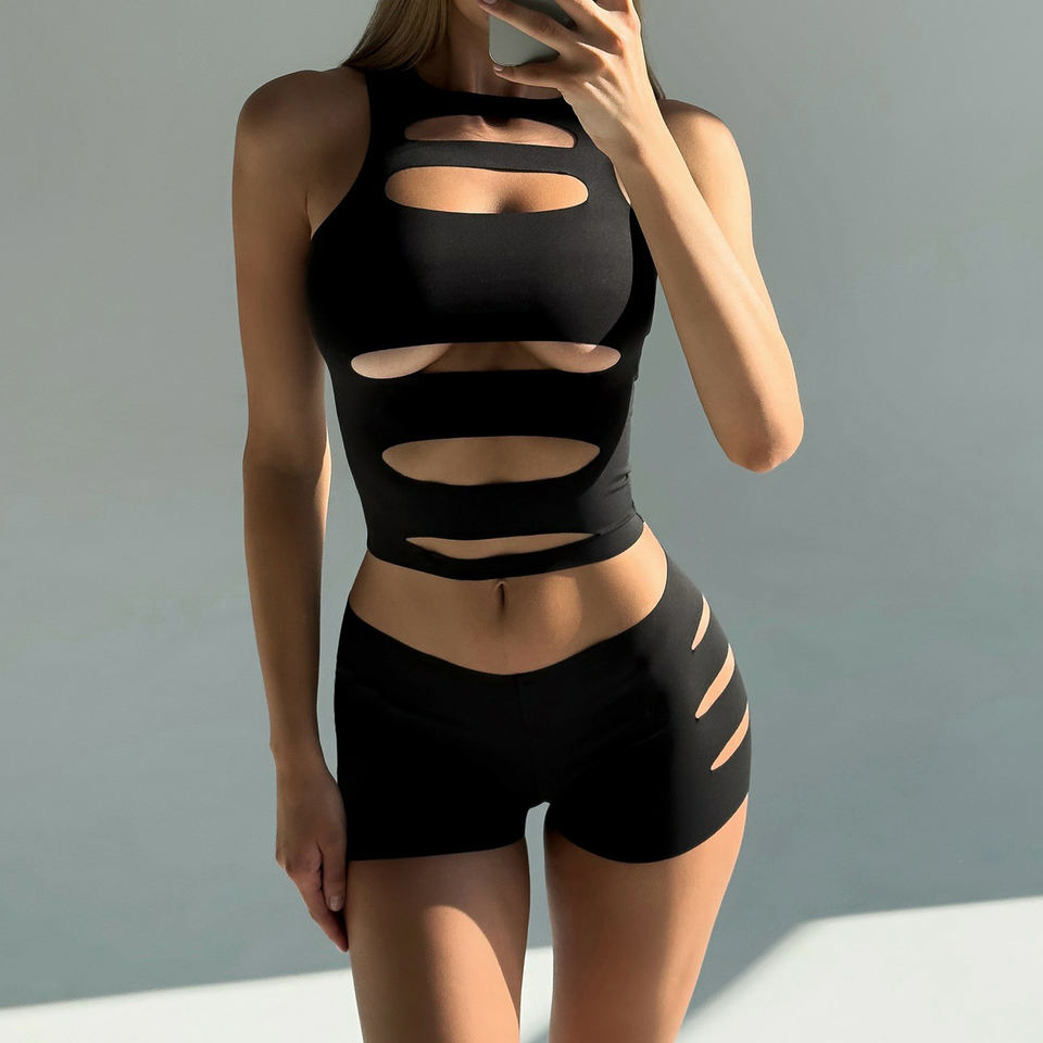 ชุดเซ็ตเสื้อครอปเว้าเซ็กซี่กับกางเกงขาสั้นเอวสูงสีดำสำหรับผู้หญิง ชุดออกกำลังกายเข้ารูปสองชิ้น แฟชั่นสปอร์ตสุดฮิต
