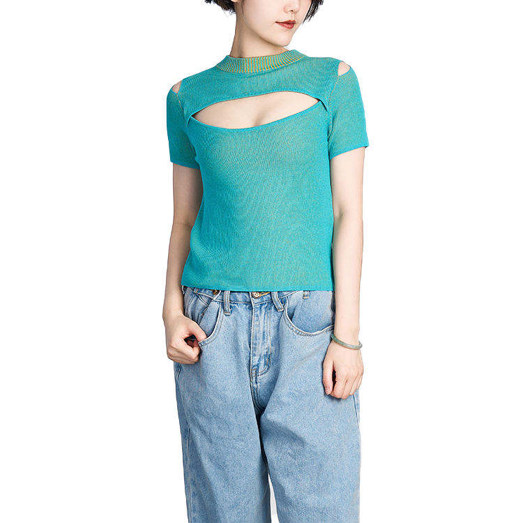 เสื้อยืดแขนสั้นสำหรับผู้หญิงเสื้อถักคอกลมผ่าเซ็กซี่