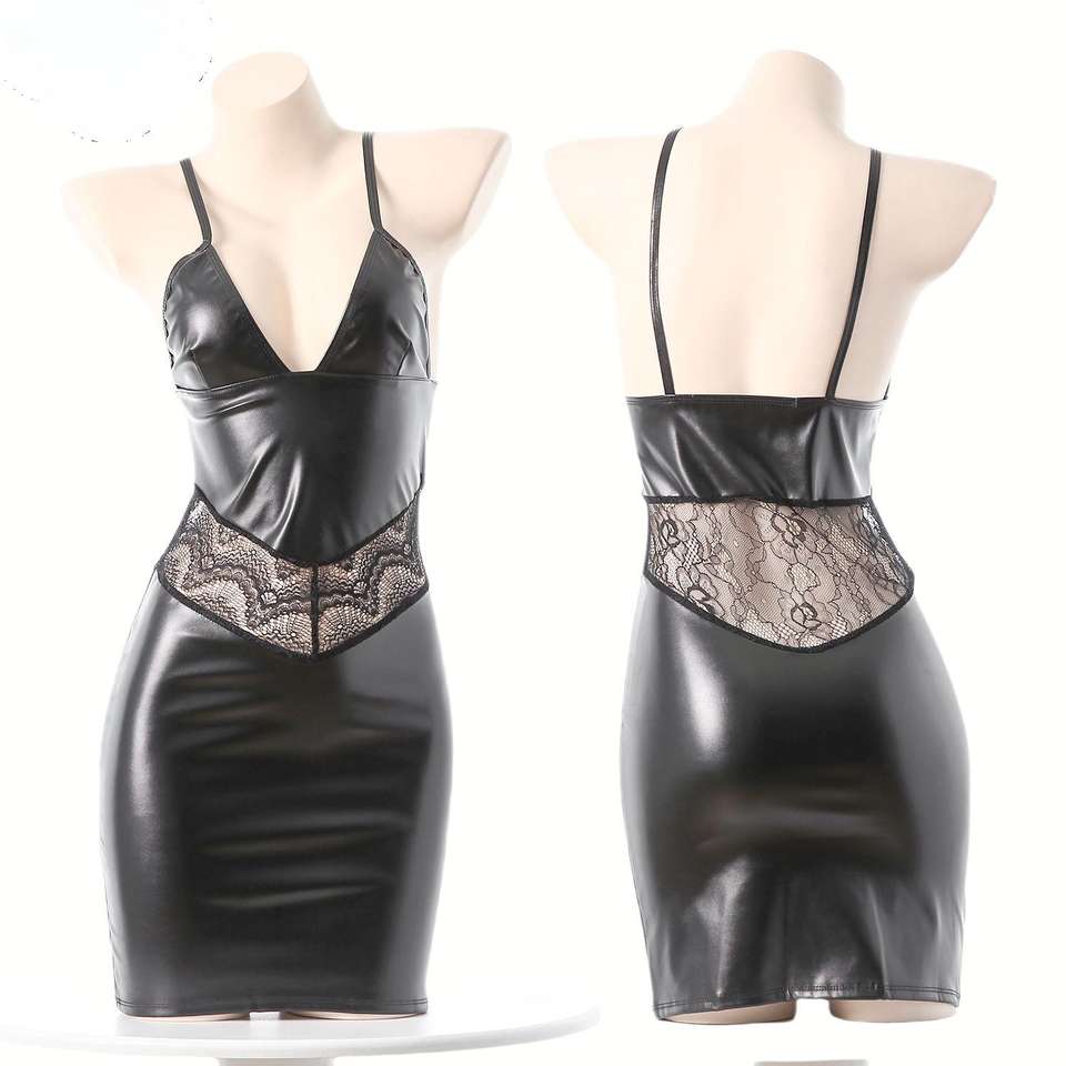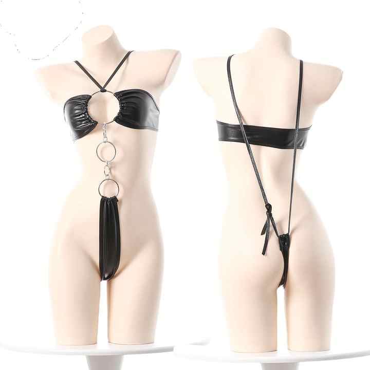 ชุดชั้นในหนังเทียมเซ็กซี่แบบเปียกเงา บราเล็ตต์ กระโปรงสั้น ชุดออกงานกลางคืน สไตล์เฟติช ชุดคลับแวร์ ชุดเต้นรำแปลกใหม่ พร้อมเครื่องประดับ