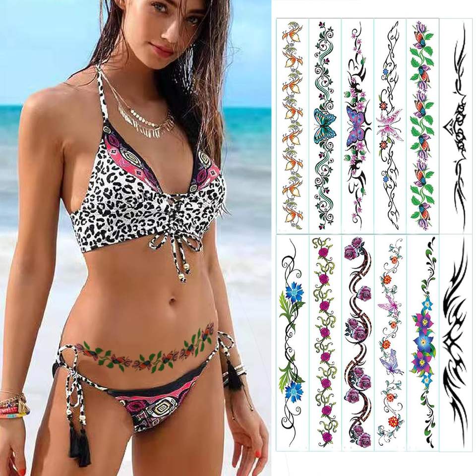 สติกเกอร์รอยสักสะดือลายดอกไม้เซ็กซี่ยาวหน้าท้องเอวหลังท้องรอยสักชั่วคราวกันน้ำสำหรับผู้หญิงรอยสักร่างกายของเด็กผู้หญิง