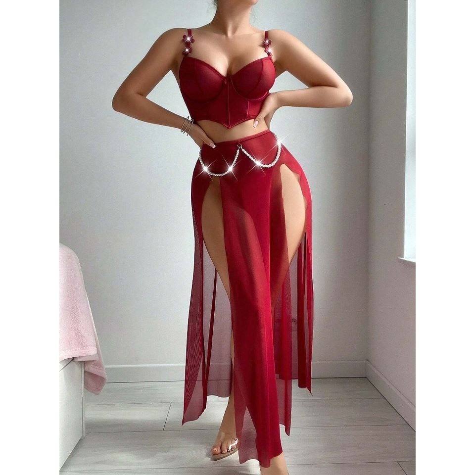 ชุดชั้นในเซ็กซี่แบบผูกคอ ผ้าตาข่ายซีทรู ประดับมุก กระโปรงผ่าข้าง ชุดเซ็ต 2 ชิ้น แฟชั่นสำหรับผู้หญิง