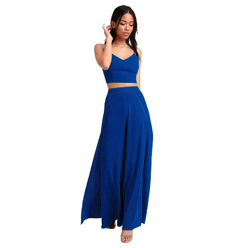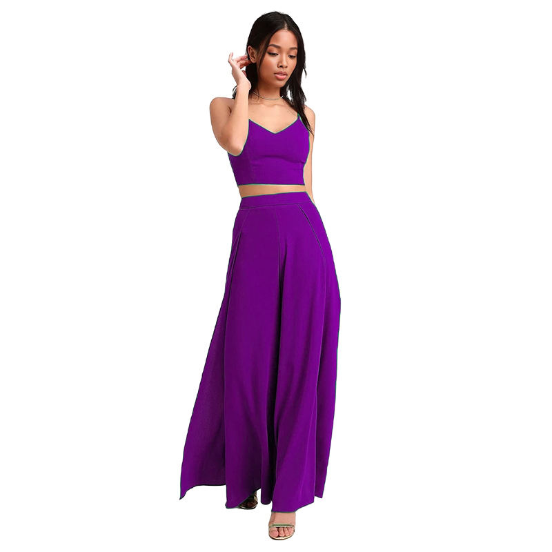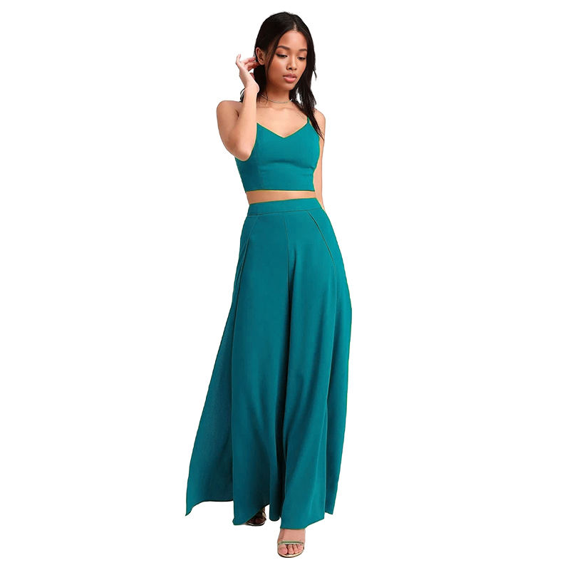 เสื้อคล้องคอเซ็กซี่กางเกงขากว้างเอวสูงสองชิ้นสีทึบชุดสตรีทสูทแฟชั่น