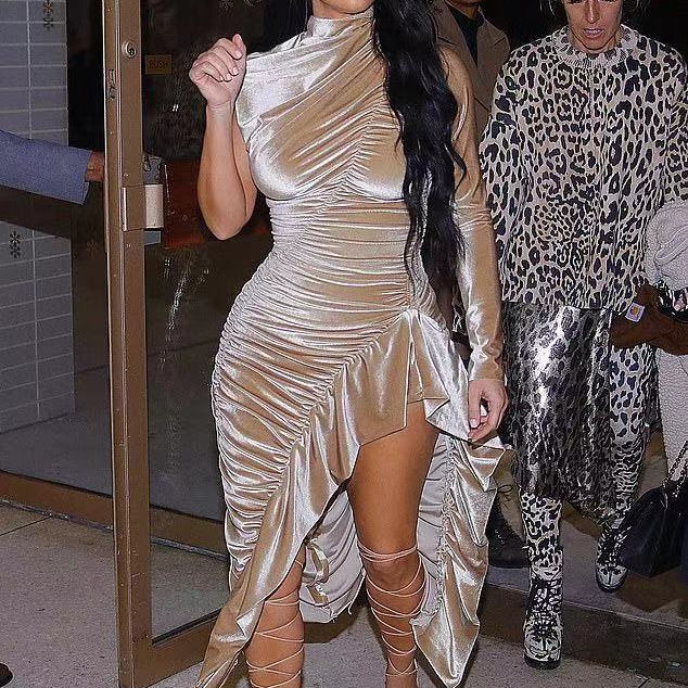 Packaging Details:1 pcs of Sexy High Neck One Sleeve High Slit Wrinkled Ruffle Velvet vestidos de noche largos Evening Dress vestidos mangas largas in a poly bag