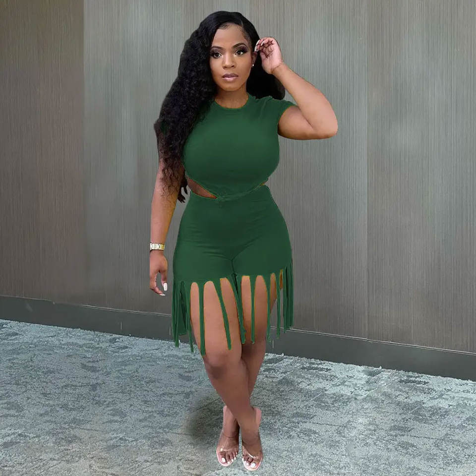 ชุดเสื้อครอปแขนสั้นสำหรับผู้หญิง,ชุดเครื่องแต่งกายเข้ารูปกางเกงขาสั้นมีพู่