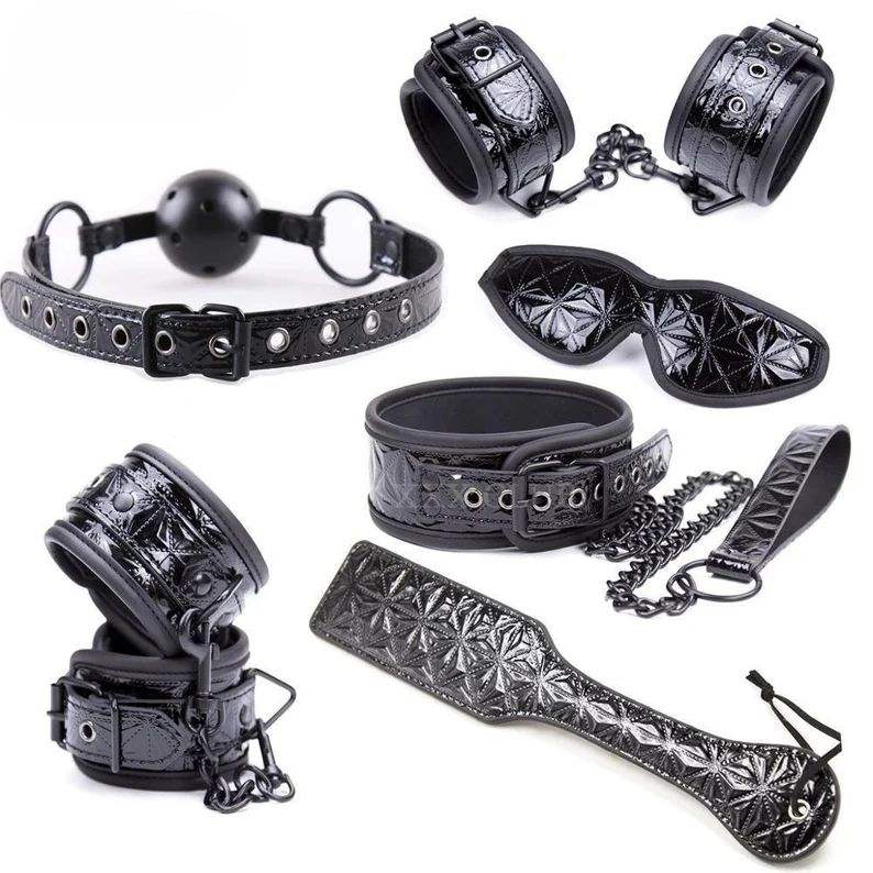 Sexy PU Leather BDSM Bondage Set Handcuffs Whip Mouth Gag Eye Mask Collar Sex Toys Couple Exotic Accessories