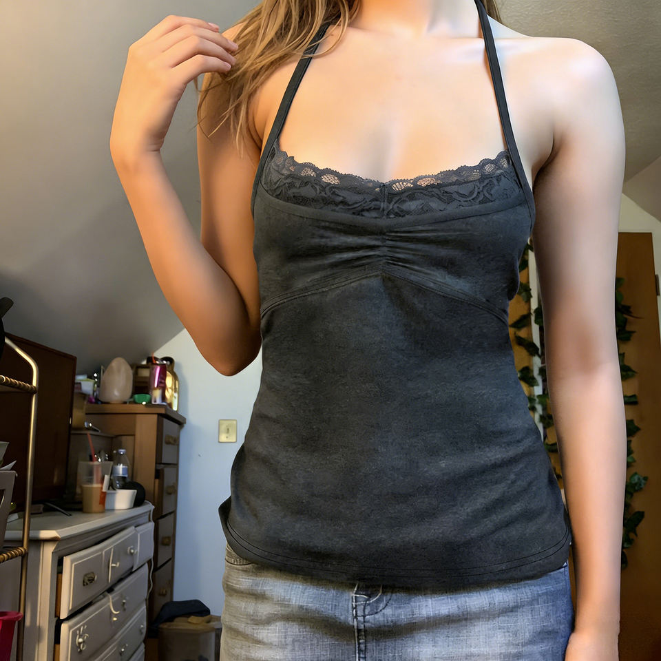 เสื้อสายเดี่ยวลูกไม้สไตล์เซ็กซี่ ดีไซน์ย้อนยุคแบบแพทช์เวิร์ค คอ halter จับจีบด้านหลัง โชว์หลังเปลือย สำหรับสาวสุดฮอต