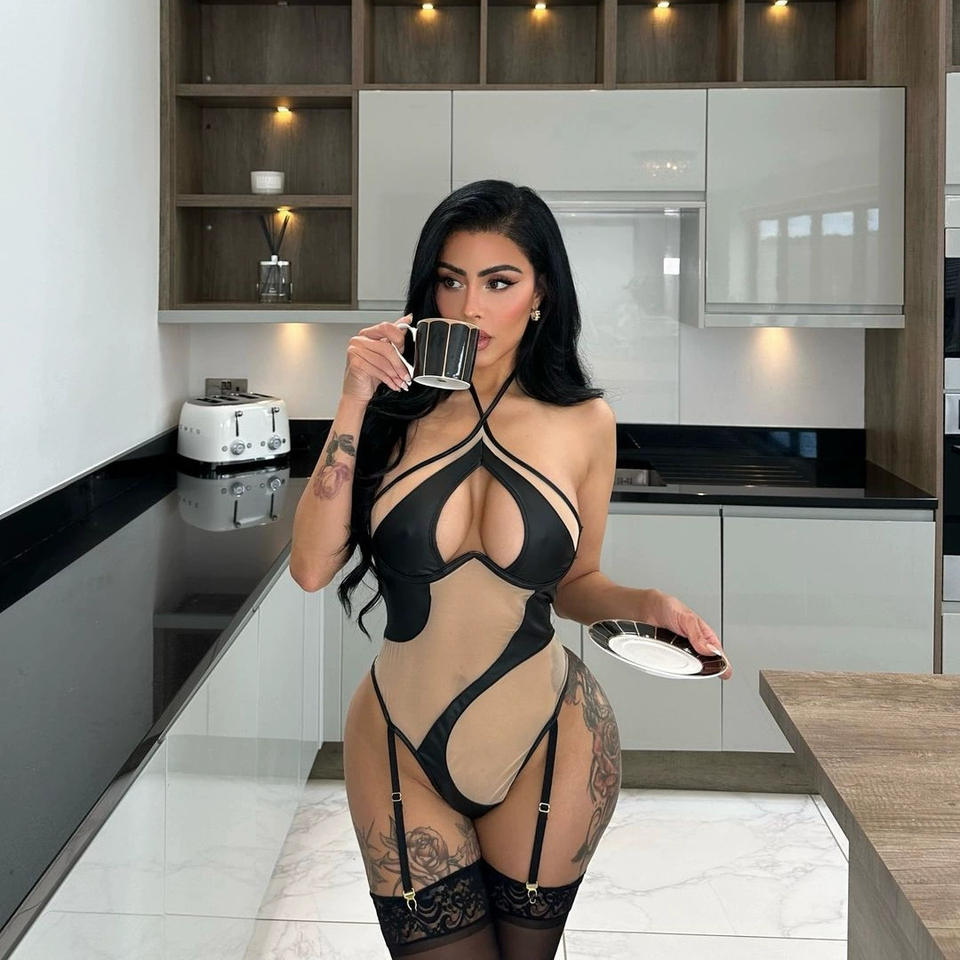ชุดชั้นในซีทรูเซ็กซี่แบบตาข่ายรัดคอ สายคล้องคอแบบเปิดหลัง ชุดบอดี้สูทแบบชิ้นเดียว