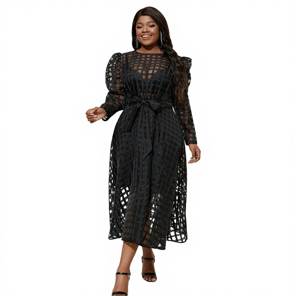 เดรสค็อกเทลผู้หญิงแขนยาวทรงเอลายสก็อต คอโอ ผ้าระบายอากาศ เป็นมิตรกับสิ่งแวดล้อม ซักได้ ผลิตจากโพลีเอสเตอร์/คอตตอน เหมาะสำหรับฤดูร้อนสุดเซ็กซี่