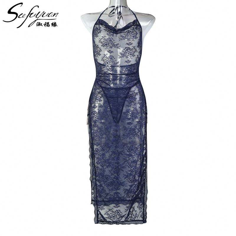 ชุดเดรสลูกไม้สีน้ำเงินเข้มสุดหรู Sfy3674 ดีไซน์เปิดหลังสุดเย้ายวน พร้อมดีเทลผ่าสูงสุดอลังการ และตกแต่งด้วยโซ่สุดเก๋