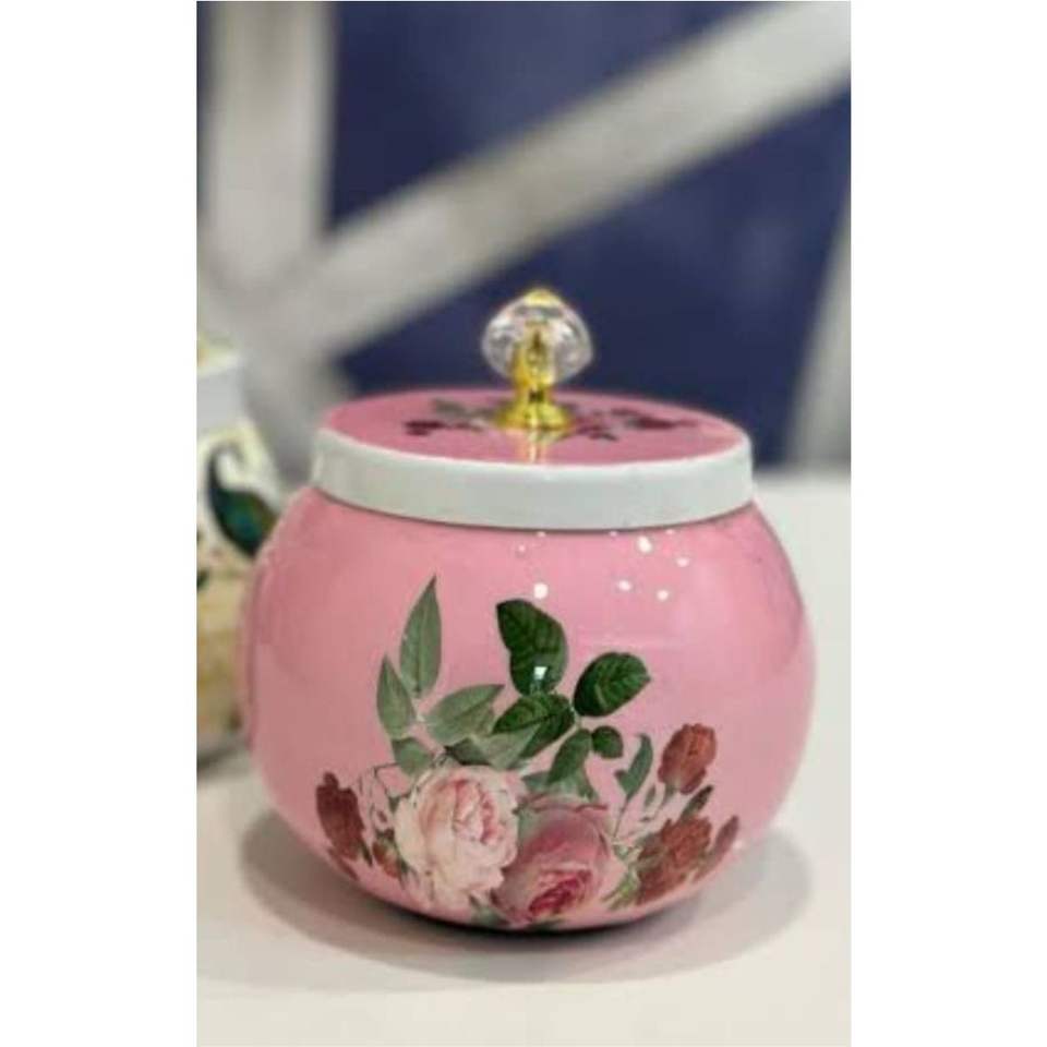 โถใส่ผลไม้อบแห้งลายกุหลาบสไตล์ชิคเก๋ ทำจากสโตนแวร์ ตกแต่งด้วยลายเพ้นท์มือสีชมพู พร้อมหูจับคริสตัลสีทอง