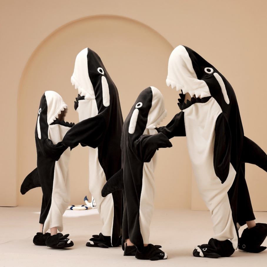 ชุดนอนชิ้นเดียวลายฉลามสำหรับฤดูใบไม้ร่วงฤดูหนาวถุงนอนน่ารักสำหรับการแสดงคู่เสื้อผ้าในบ้านถุงนอนปลาฉลาม