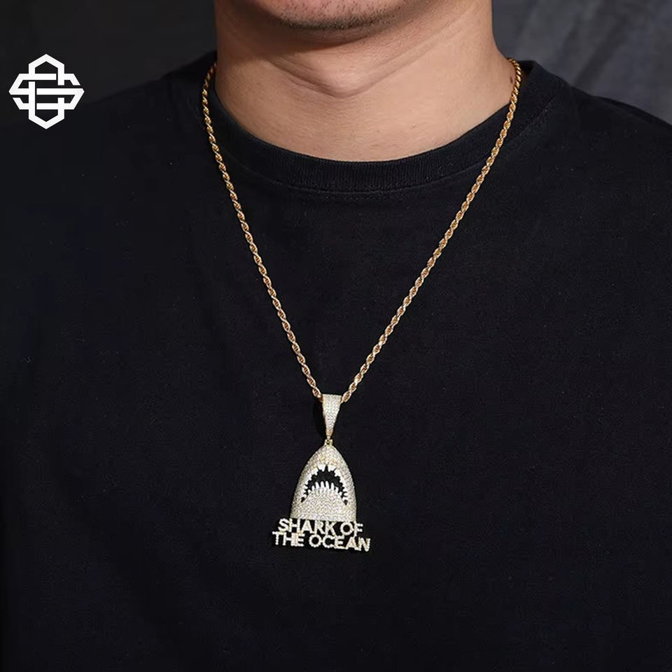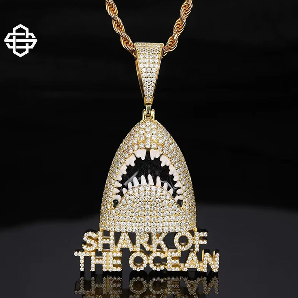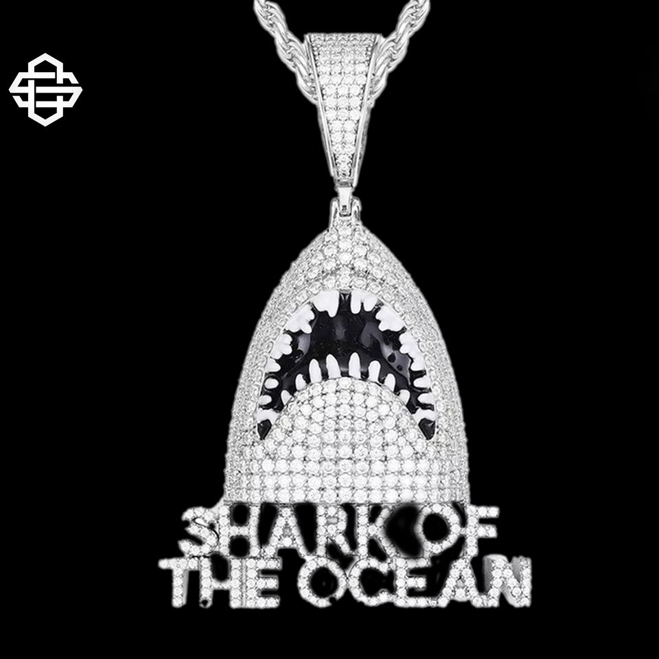 สร้อยคอจี้รูปฉลาม สไตล์ฮิปฮอป แร็ปเปอร์ ประดับเพชร ดีไซน์ธีมมหาสมุทร โลหะผสม ประกายวิบวับ โดดเด่นสะดุดตา สำหรับผู้ชาย