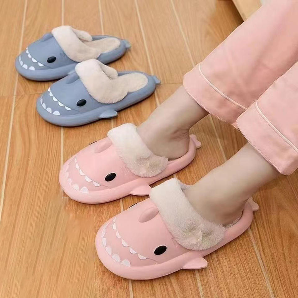 รองเท้าแตะขนฟูสำหรับผู้ใหญ่และเด็ก ลายฉลาม สำหรับฤดูหนาว พื้นรองเท้าด้านบนและด้านล่างทำจาก EVA เหมาะสำหรับใส่ในบ้าน/นอกบ้าน