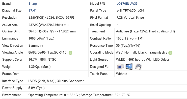 จอแสดงผล Sharp LQ170E1LW33 ความสว่างสูง 1000 นิต ขนาด 17 นิ้ว TFT LCD ความละเอียด 1280x1024 มุมมองกว้าง 85 องศา LVDS WLED Backlight อุณหภูมิใช้งาน -20~70 องศาเซลเซียส 1 ชิ้น