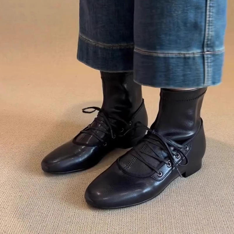 รองเท้าบูทมาร์ตินทรงกลมแบบเรโทรใหม่ ปี 2025 รุ่นหนังแกะ ทรงแบน ช่วยให้เท้าดูเรียว แบบผูกเชือก ยืดหยุ่น กระชับเท้า