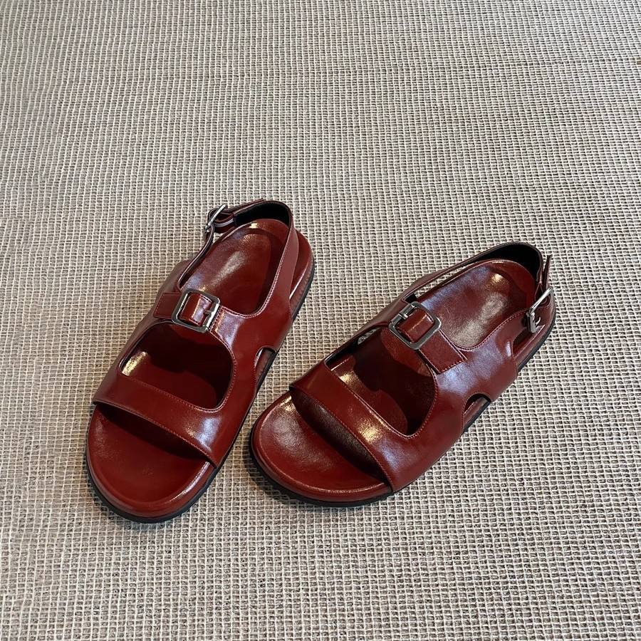 รองเท้าแตะส้นแบนแบบเปิดนิ้วเท้า ดีไซน์สายรัดแบบหัวเข็มขัดสไตล์เรโทร ทำจากหนังแกะ สำหรับผู้หญิง เหมาะสำหรับใส่เที่ยวทะเลหรือทำกิจกรรมกลางแจ้ง