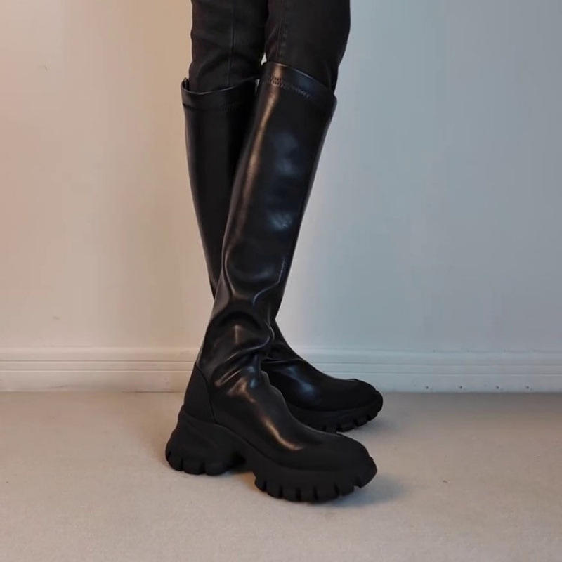 รุ่นหนังแกะ ~ รองเท้าบูทสูงเหนือเข่าแบบซ่อนส้นสำหรับผู้หญิง ทรงเข้ารูป ยืดหยุ่น กระชับรูปร่าง สไตล์ลำลอง สปอร์ต รองเท้าบูทขี่ม้า
