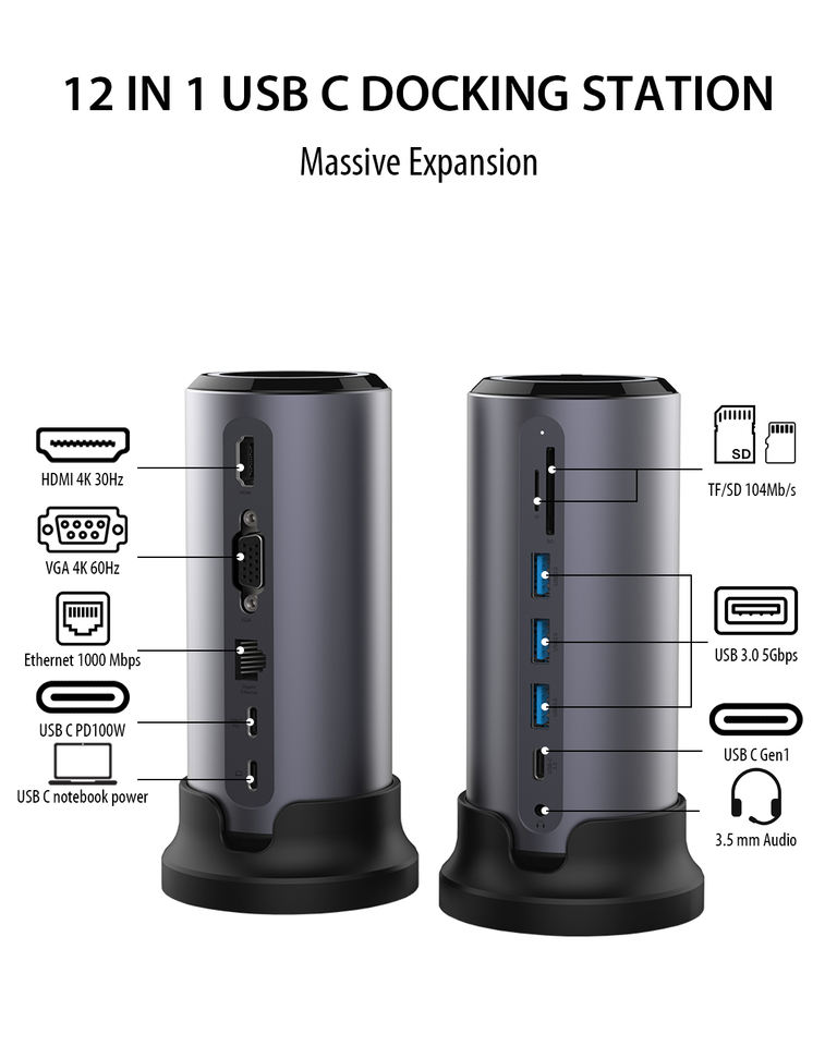 Shenzhen Pulwtop แท่นชาร์จแบตเตอรี่แล็ปท็อป12 in 1, ที่หนีบ USB ฮับแบบหลายพอร์ต5/10/12 in 1 Type C 3.0ฮับ
