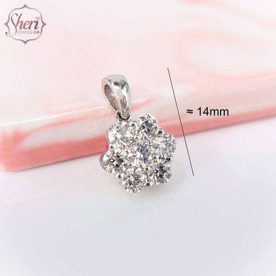 จี้เพชรแท้ทรงกลมเจียระไนแบบบริลเลียนท์ น้ำหนัก 1.25 กรัม สี G-H ความใส SI1-2 รูปทรงดอกไม้ ทำจากทองคำขาวแท้ 18K สำหรับผู้หญิง จากเชอรี่ จิวเวลส์
