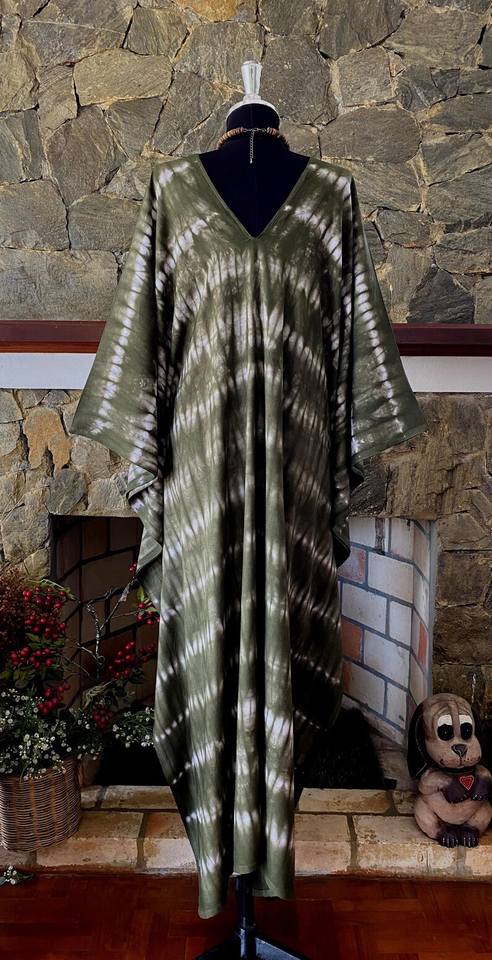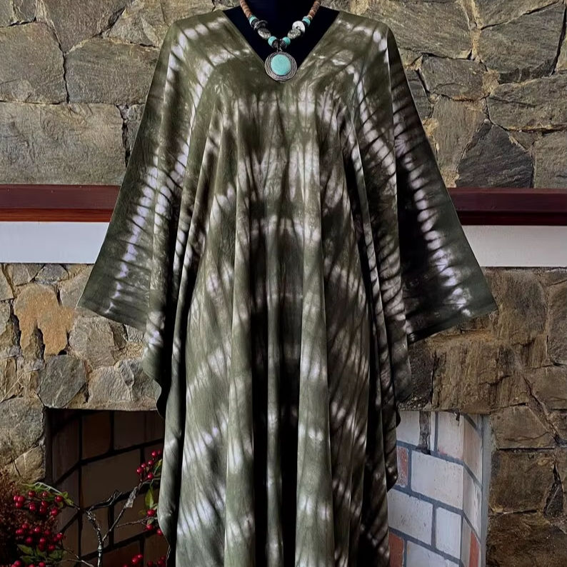 ชุดเดรสคาฟทันผ้าเรยอนย้อมสีชิโบริ สีเขียวมะกอก คอวี ไซส์เดียว ทรงหลวม สวมใส่สบายสำหรับผู้หญิง