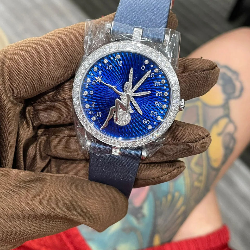 นาฬิกาข้อมือสายหนังแท้ลายดอกไม้สไตล์นางฟ้าสำหรับผู้หญิง ดีไซน์หรูหราประดับเพชรซิร์คอน