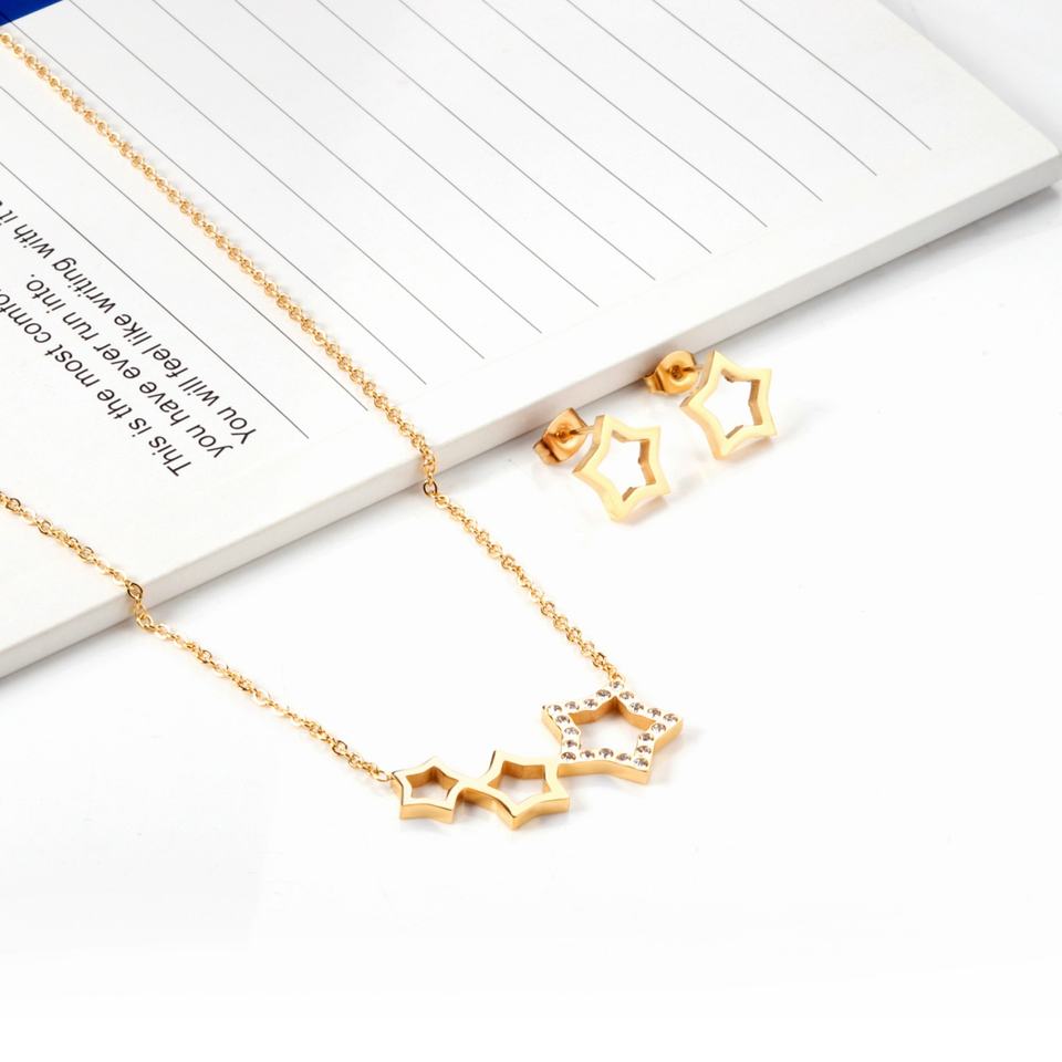 ชุดเครื่องประดับรูปดาวชุบทองสแตนเลสสตีลส่องประกาย ประดับเพชรซิร์คอน ต่างหูและสร้อยคอสำหรับผู้หญิง