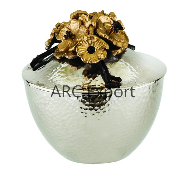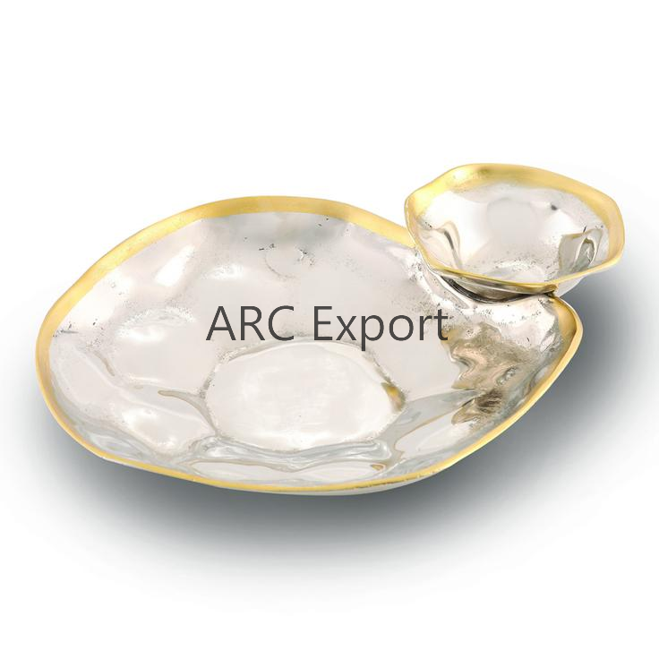 ชามเสิร์ฟโลหะสีขาวและทองสำหรับโรงแรมรีสอร์ทและโต๊ะงานกิจกรรมตกแต่งชิปมันวาวและจุ่ม