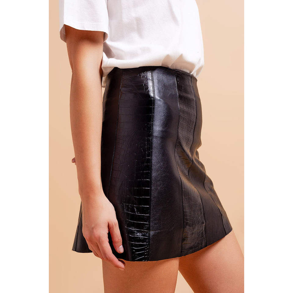 กระโปรงมินิทรงตรงและทรงดินสอสีดำสไตล์โกธิค ยี่ห้อ Shiny Croc ทำจากหนังแท้และผ้าเดนิมผสมขนสัตว์ พร้อมสแปนเด็กซ์ ดีไซน์เรียบง่าย