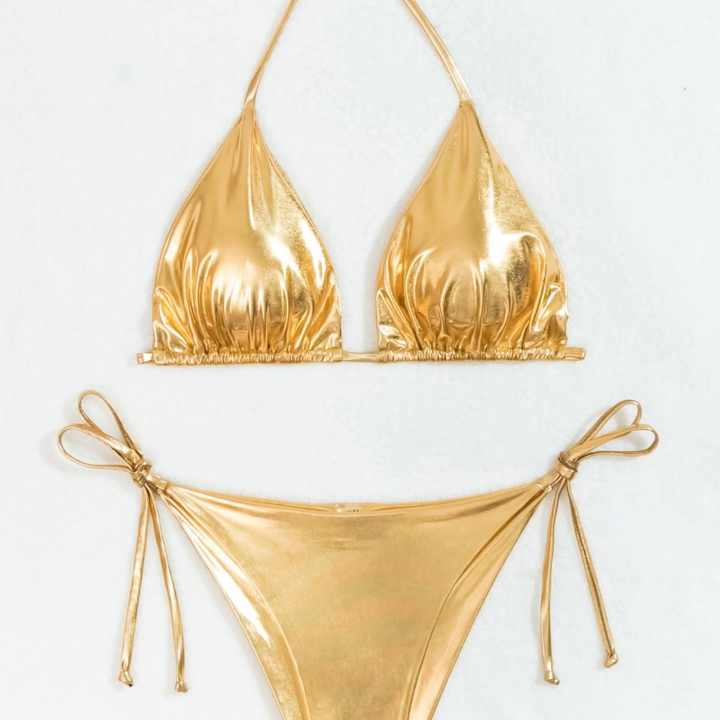 ชุดว่ายน้ำผู้หญิงแบบผูกข้าง สายคล้องคอ เงางามแบบเมทัลลิก - ชุดว่ายน้ำแบรนด์ส่วนตัว 2 ชิ้น แห้งเร็ว บราดันทรง บิกินี่