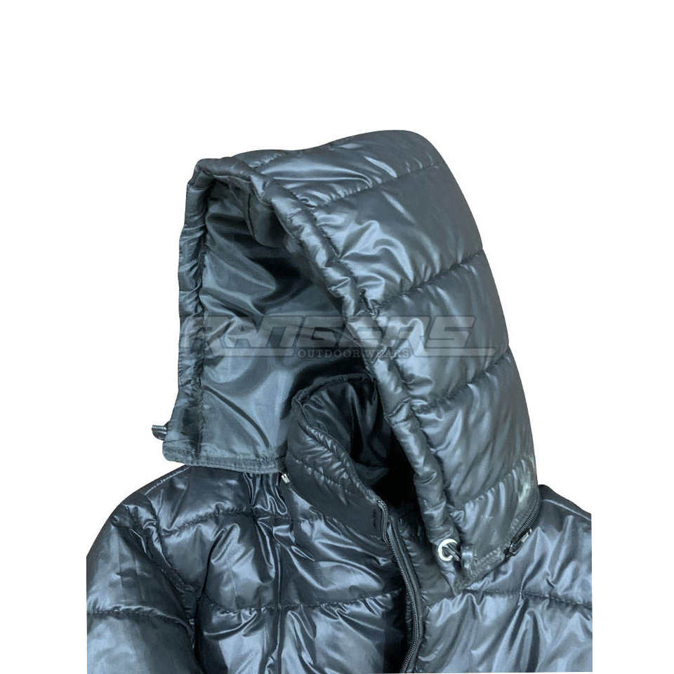 เสื้อพัฟเฟอร์ผู้ชายแบบมันเงา คุณภาพสูง กันลม ผู้ผลิตเสื้อผ้า OEM รับผลิตจำนวนน้อย เสื้อโค้ทพัฟเฟอร์มีฮู้ดกันน้ำ