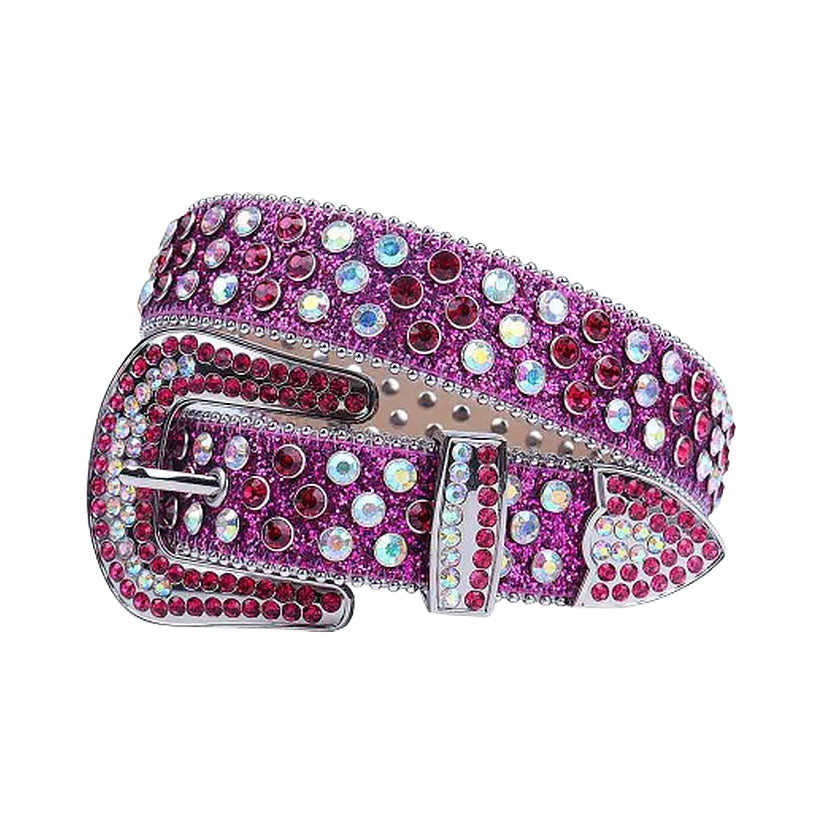 สายสีม่วงแวววาวพร้อมเข็มขัดประดับพลอยเทียมสีแดงและคริสตัล
