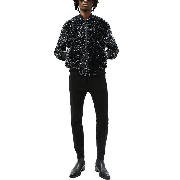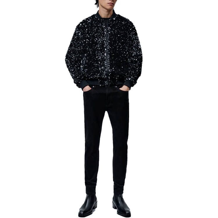 แจ็คเก็ตบอมเบอร์ประดับเลื่อมวิบวับสำหรับผู้ชาย รุ่นใหม่ล่าสุด ลายทางสีทองวิบวับ ซิปแจ็คเก็ตและเสื้อโค้ทผู้ชาย สำหรับงานปาร์ตี้ เต้นรำ และการแสดง