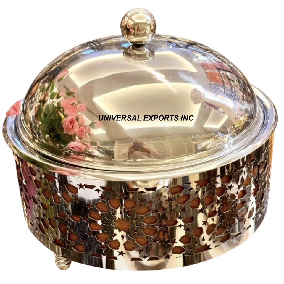 หม้อโลหะเคลือบเงาสีเงินพร้อมโดมไม้ด้านในหม้อปรุงอาหารแฮนด์เมดรูปทรงกลมที่อุ่นอาหารทำจากโลหะแฟนซี