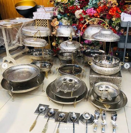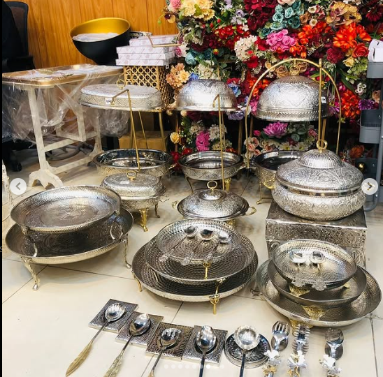จานอุ่นอาหารสแตนเลสสีเงินมันวาวสำหรับ7L โรงแรมจานเสิร์ฟหรูหราปรับแต่งจานอุ่นอาหารแฟนซี