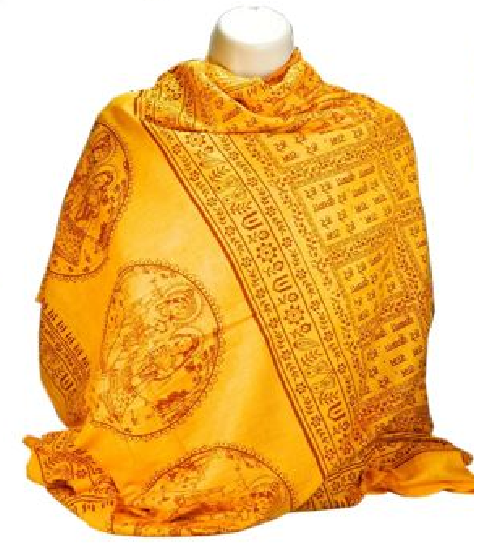 ผ้าคลุมไหล่พิมพ์ลายมันตราเกียตารี มันตราศิวะ ผลิตจากผ้าวิสโคส สำหรับทุกเพศ ผลิตที่วราณาสี อินเดีย