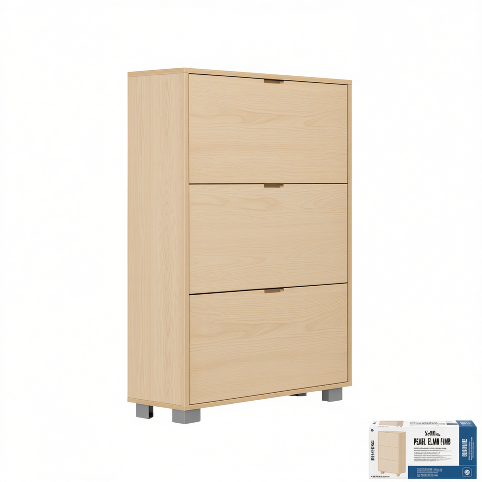 ชั้นวางรองเท้าพร้อมบานพับ 3 บาน ทำจากไม้เมลามีน ขนาด L76xH118xD30 สีเพิร์ลเอล์ม