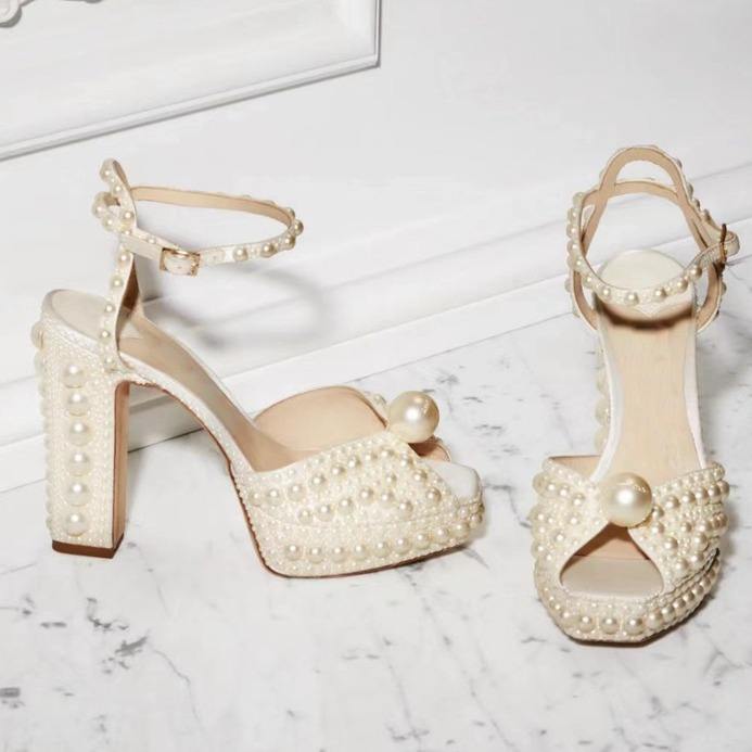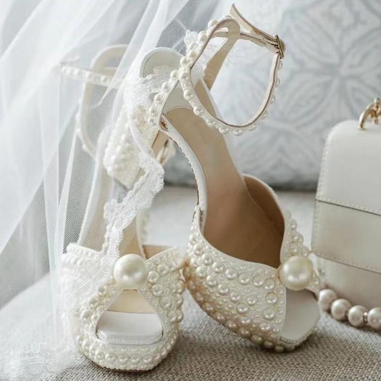 รองเท้าสำหรับผู้หญิงส้นหนาประดับลูกปัดรองเท้าแตะปากปลาส้นสูง35-41กันน้ำได้สำหรับงานแต่งงาน