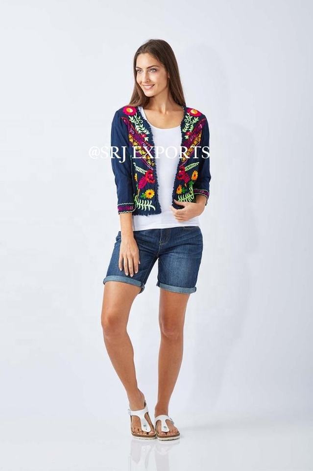 เสื้อแจ็คเก็ตสไตล์วินเทจ งานปักลายดอกไม้โบฮีเมียน ทำมือจากอินเดีย แต่งชายเสื้อแบบฟリンจ์ เหมาะสำหรับใส่เที่ยวทะเลหรือพักผ่อนริมชายหาด