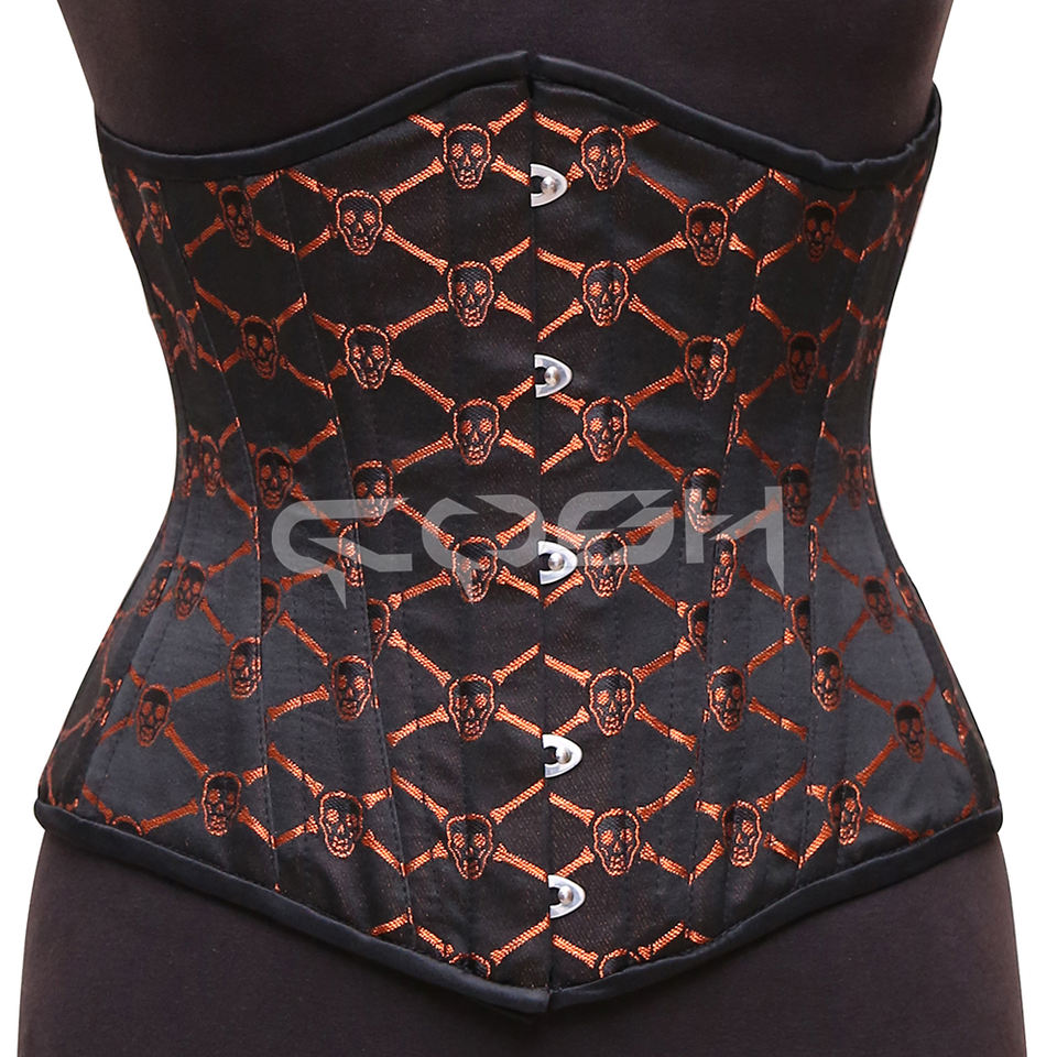 ช้อปเลย! คอร์เซ็ตผ้าไหมสีดำพรีเมียมลายหัวกะโหลกสีส้มของเรา | | รุ่นโกธิคสุดพิเศษโดยคอช คอร์เซ็ทส์