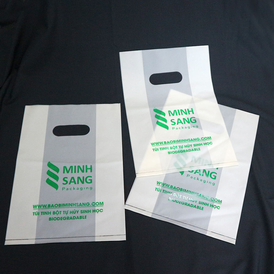 ถุงช้อปปิ้งที่ออกแบบมาเพื่อการจัดเก็บที่สะดวกและใช้งานซ้ำได้ ผลิตจากวัสดุที่ทำจากแป้งข้าวเจ้าและมีรูปลักษณ์เรียบง่าย